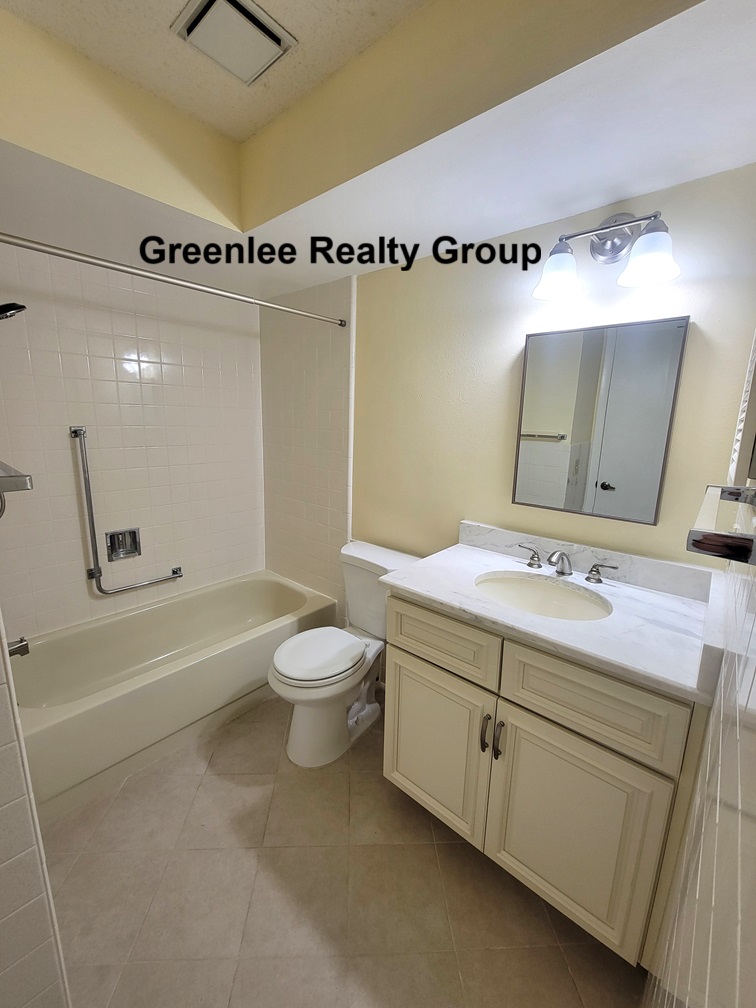 The primary suite includes a generous walk-in closet with ample shelving and an updated en-suite bathroom with a step-in shower featuring grab bars and a modern double vanity. The split floor plan places the guest bedroom and full guest bath—complete with a bathtub and grab bars—at the front of the home, offering privacy for both you and your guests.
