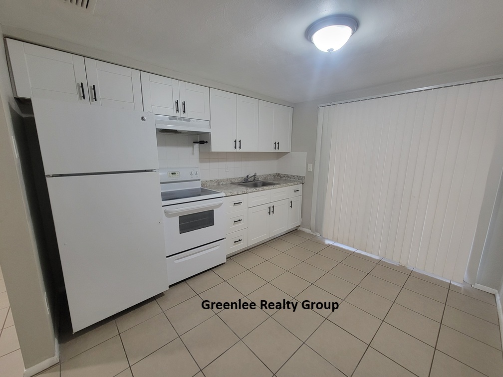 The updated kitchen offers newer cabinets and a sliding glass door leading to a covered screened-in porch.