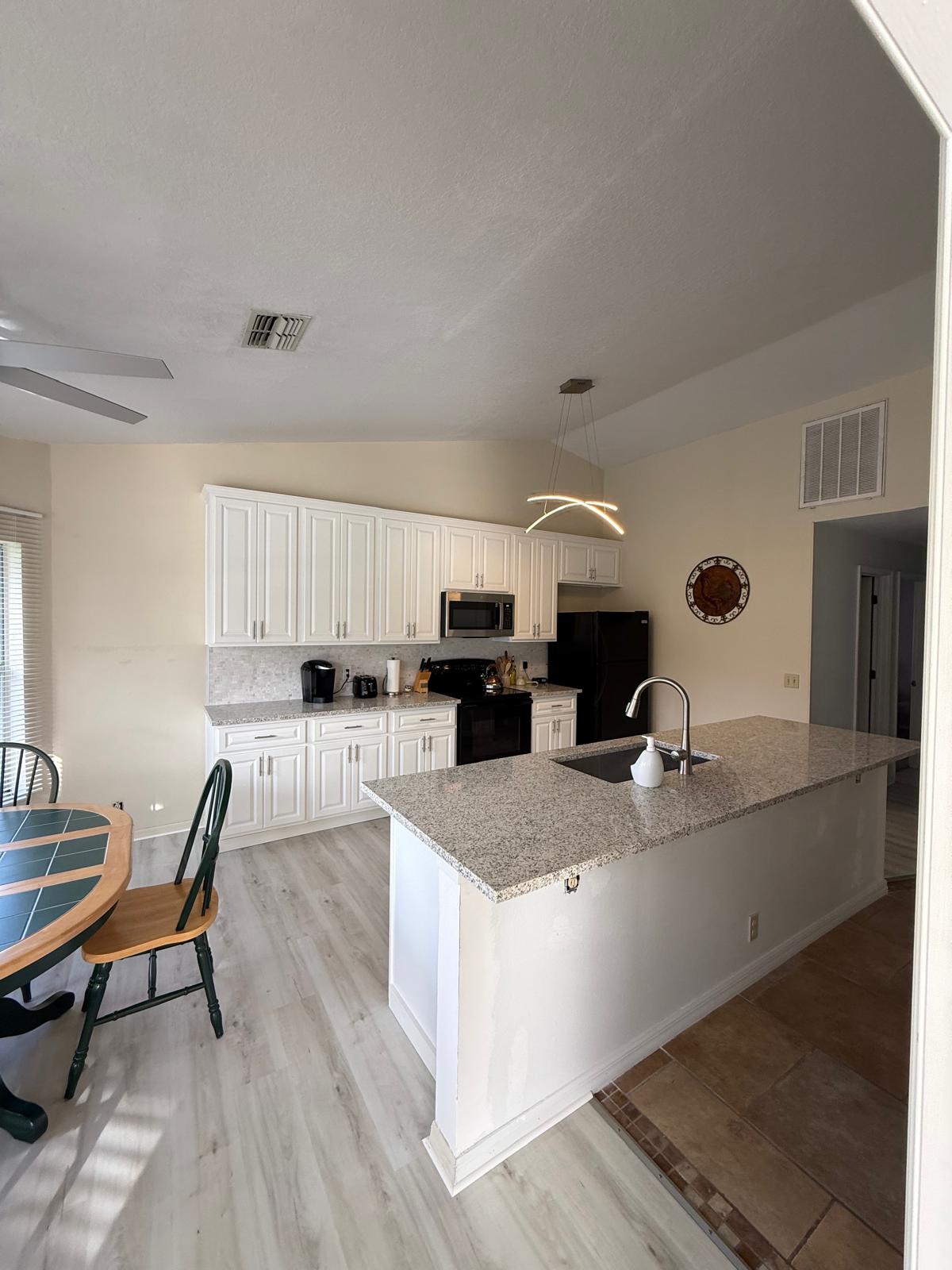 This home offers a split floor plan. When you walk inside the main bedroom is to the left. It is spacious and features a large walk in closet, a private full bath and access to the screened-in Pool. The other guest bed and bath are on the other side of the home. The guest bedroom has a large walk-in closet as well! Both bedrooms have carpet. A bonus den is off the Living room. The BRAND NEW kitchen is gorgeous- It has been opened up and has New Cabinets, New Countertops, New Backsplash, New Island, New lighting, New flooring! The dining area is off the kitchen. It has access to the pool and ample windows to let in natural light. Washer and Dryer for tenant’s use is in the 2-car garage.