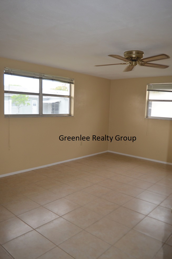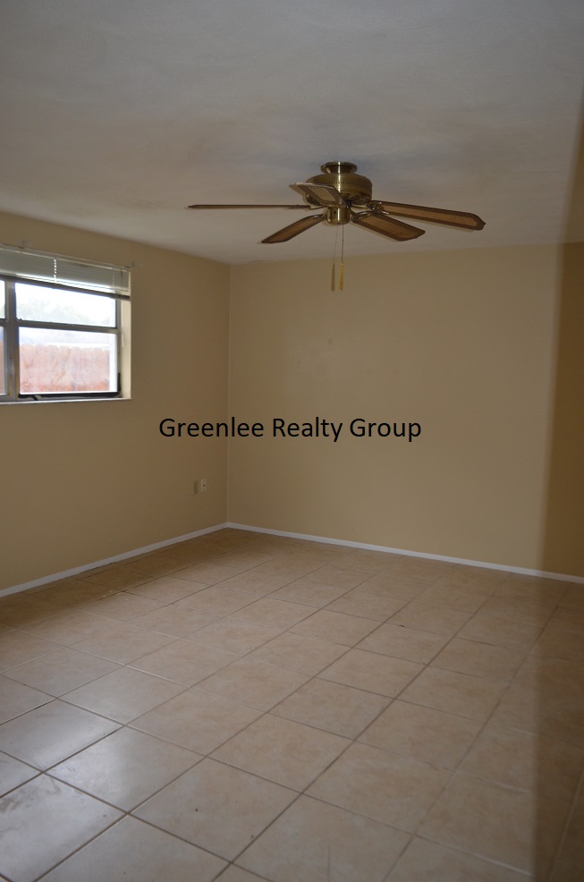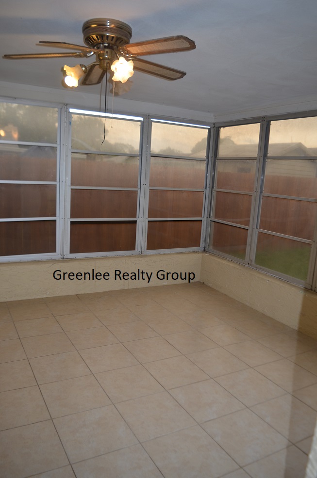 Screened-in Back Porch that is Tiled and has a Ceiling Fan